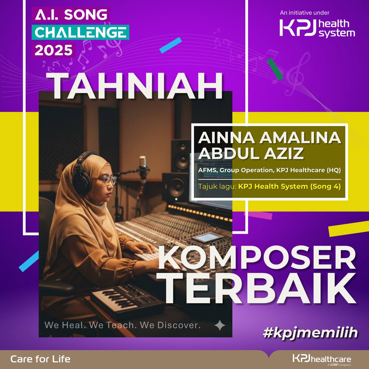 Tahniah kepada Ainna Amalina Abdul Aziz, Komposer Terbaik dan juara A.I. Song Challenge 2025! Karya beliau membuktikan bahawa kreativiti dan inovasi mampu bersatu dalam satu melodi yang menginspirasi.